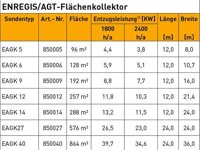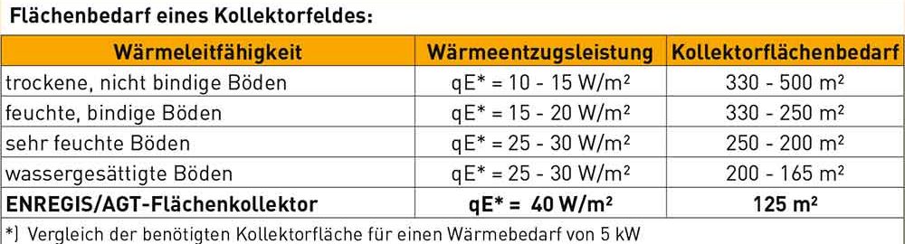 Je nach benötigter Entzugsleistung werden ähnlich wie bei einer Fußbodenheizung, mehrere Kollektorkreise über einen Verteiler zur Wärmepumpe geführt. Die spezifische Entzugsleistung von Flächenkollektoren steht in direktem Zusammenhang mit der Bodenbeschaffenheit. So wird die höchste Entzugsleistung bei wassergesättigtem Boden bzw. in grundwasserführendem Erdreich erreicht. Die Wirkungsweise des ENREGIS/AGT-Flächenkollektors nutzt die-se Tatsache konsequent aus.